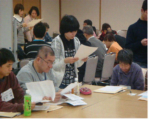 利用者部会に行きました。4人で行きました。行って今とはなしをしました自立支援法こと新しいはなしをきいてげきもありました。そこで京都の西村直さんがはなしもありました。とどうふけんのしせつのはっぴょうもありました。しつもんもありました。きいてぼくはおもったことはちょっとむずかしかったです。1にちめおわりました。2かめは朝行ってグループにわかれてはなしをしました。そこで朝のあいさつしてみなさんの名前をいてました。そこで自治会のレポートをはっぴょうをしました。きんちょうしたけどがんばっていえました。そこでみなさんいけんをいってました。おわってへいかいしきをしました。そこでグループのはっぴょうをきいてさいごはあきやすきみこさんがさいごのことばをいっていました。つかれました。楽しかったです。 石川久